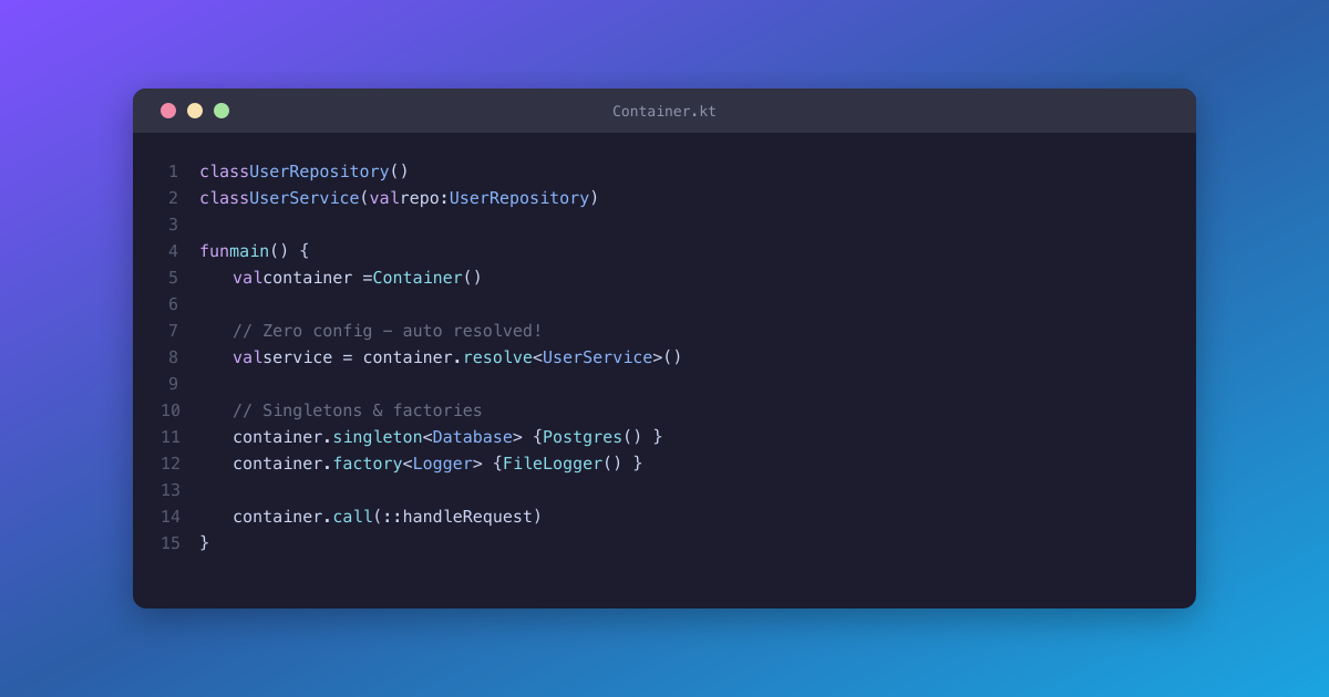 Porque a veces no necesitas un framework completo. Si tu proyecto es una API pequeña, una herramienta CLI, o simplemente quieres DI sin la ceremonia de Dagger o la magia de Spring, kotlin-container ocupa ese espacio intermedio: suficiente potencia con mínima fricción.